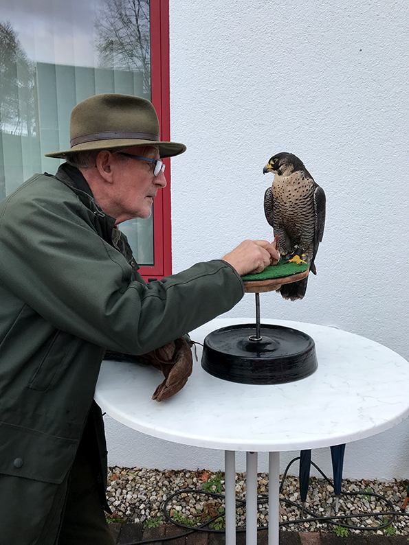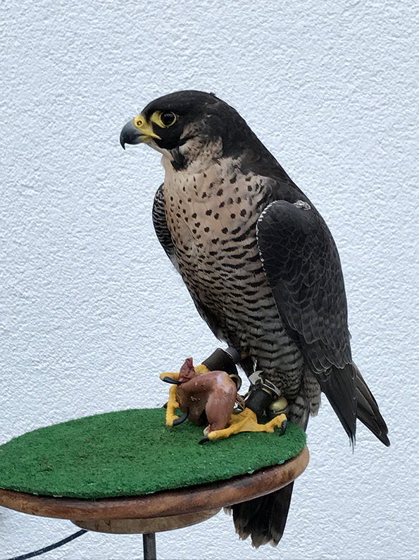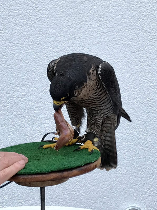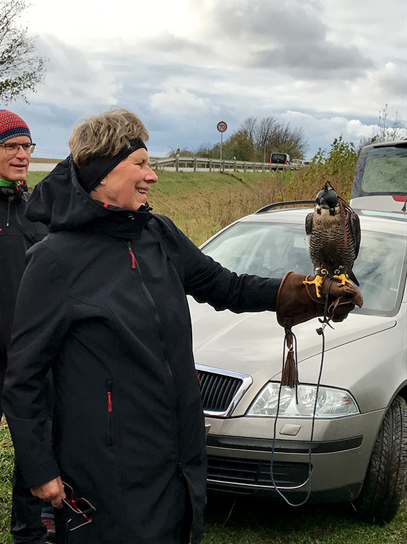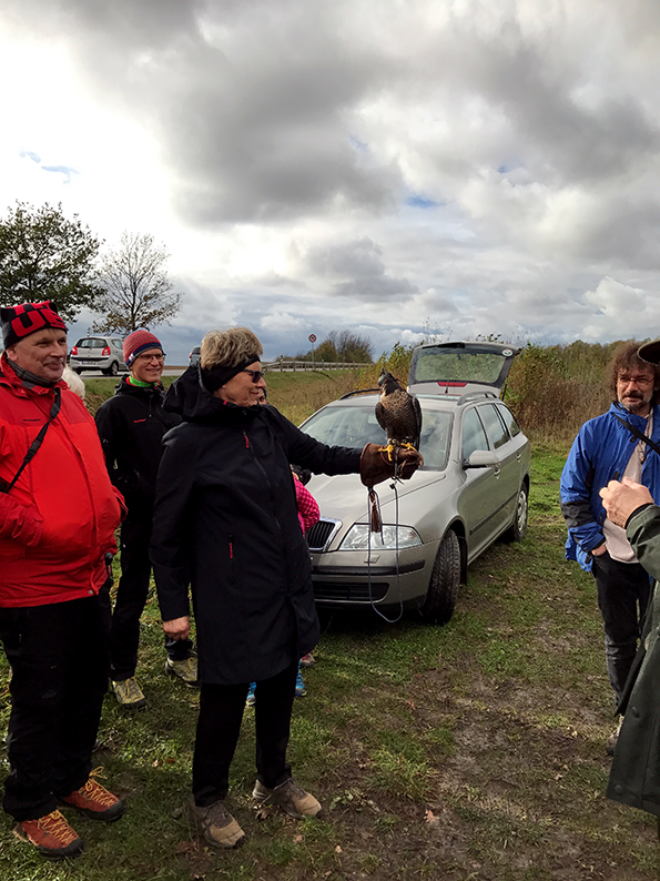 Dann ging es im straffen Wanderschritt über den Kirchweg weiter RIchtung Augustusburger Straße. Hier erwartete uns an einer Weggabelung ein Vogelkundler, der einen wunderschönen Wanderfalken mitgebracht hatte. Wir erfuhren nach gebührender Bewunderung des Tieres, dass der Wanderfalke der schnellste Jäger des Lüfte ist.