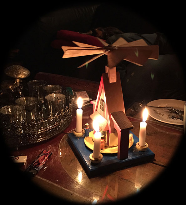 Während im Süden Europas vor allem grüne Zweige ins Haus geholt wurden, waren es im Norden eher Lichter, die man aufstellte, um die Dunkelheit zu vertreiben. Im Laufe der Jahrhunderte vermischten sich diese Bräuche, und aus vier mit grünen Zweigen umwundenen Stäben, die am oberen Ende zusammengebunden und mit Lichtern versehen waren, entwickelten die Bergleute des Erzgebirges die heute noch gebräuchliche Pyramide. Sie stellt allerdings keinen Baum als Symbol ewigen Lebens, sondern die Pferdegöpel aus dem Bergbau nach. Das Innere des Stabgestells wurde mit in Handarbeit hergestellten Figuren, die Weihnachts- und Heimatmotive darstellten, bestückt, und die Kerzen wurden außerhalb der Drehscheibe statisch angebracht.
